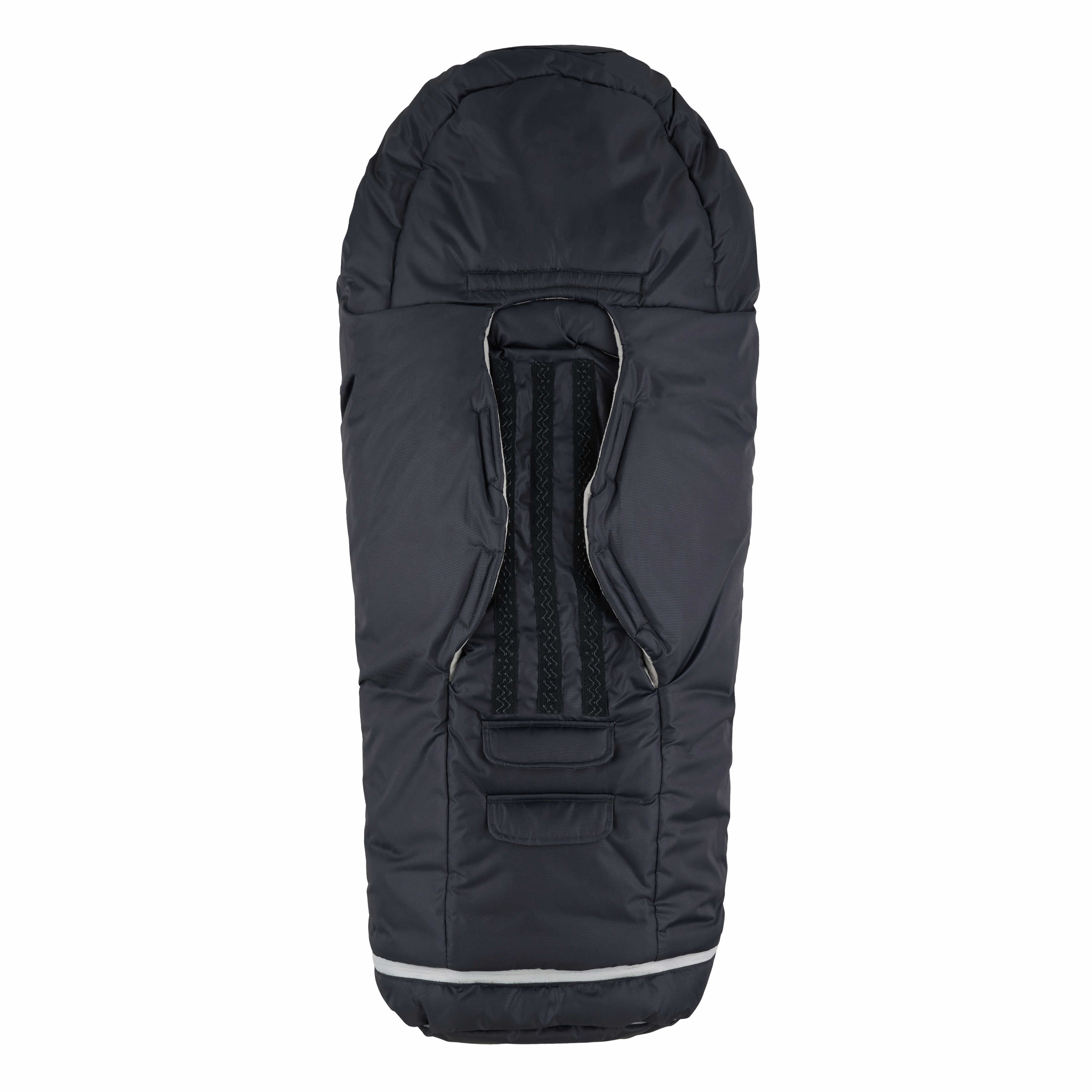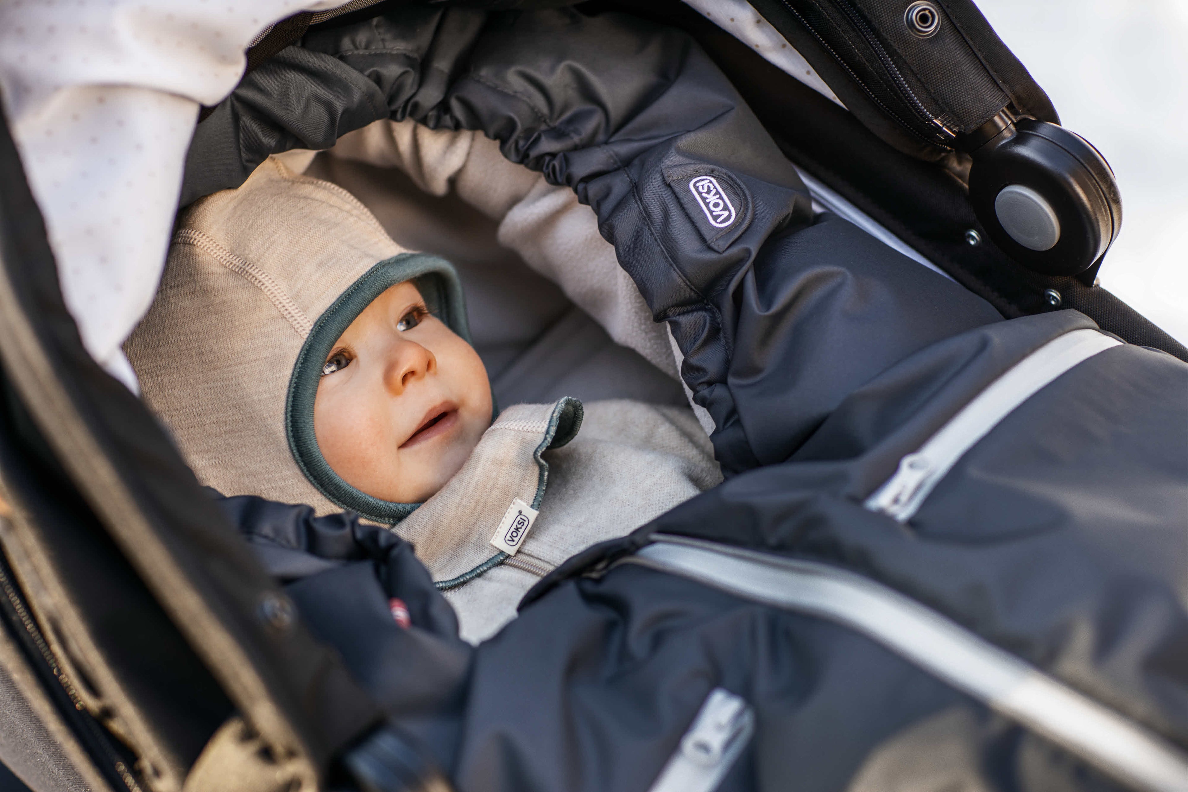 The outer material of the sleeping bag consists of a polyester membrane fabric with taped seams and zip fasteners and has a coating of BIONIC-FINISH®ECO. All the materials in Voksi® Active are OEKO-TEX®standard 100, class 1 certified, which is a quality label that indicates that none of the materials in the product contain harmful chemicals. It is therefore not necessary to wash the product before use. The unique back opening design allows this sleeping bag to be easily assembled and used in prams with different harnesses. The Voksi® bag is equipped with an anti-slide material on the back, which means that it stays in place in the pram without slipping.