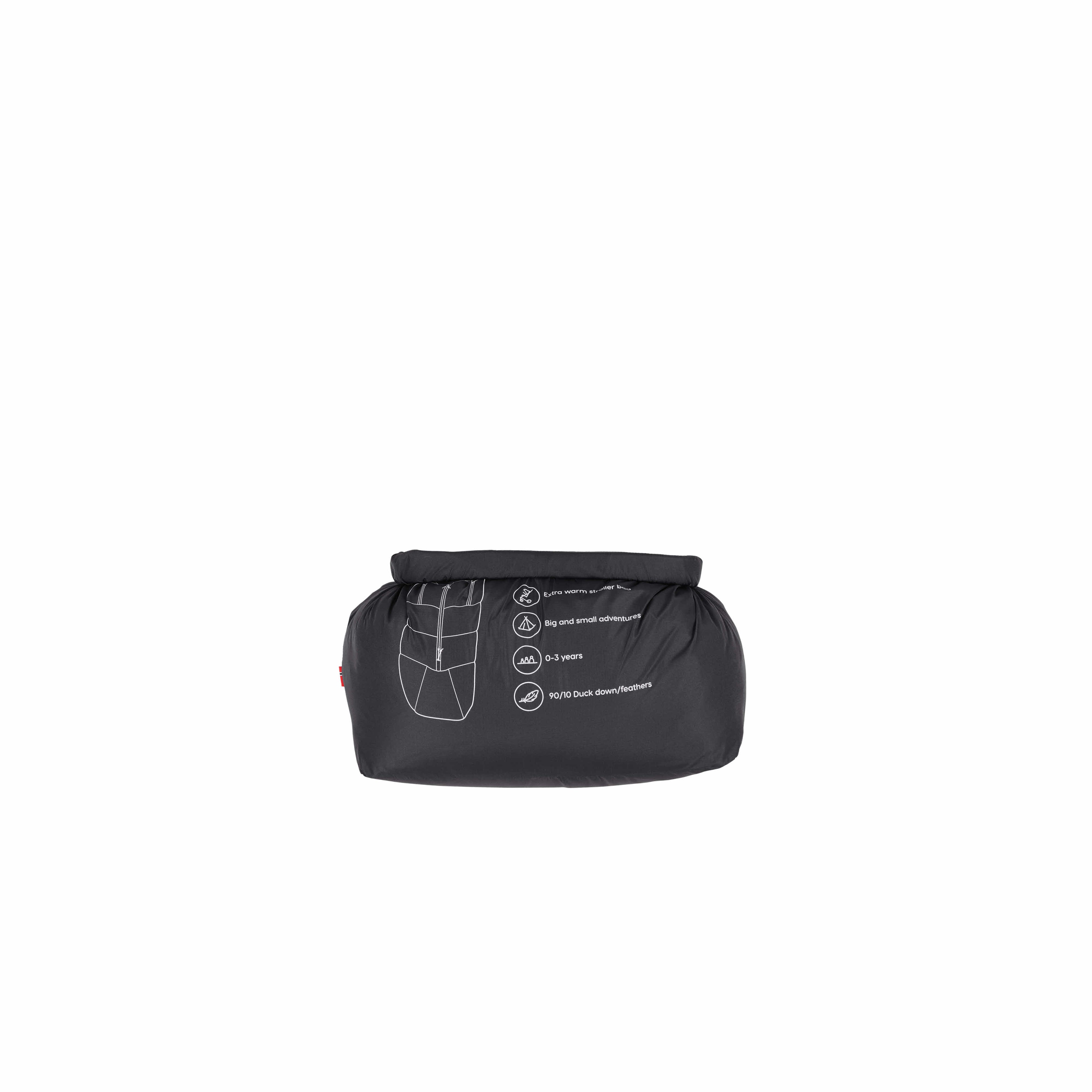 The sleeping bag can be used up to 3 years and fits to families that like to explore the nature and spending time outdoor together. The materials in this footmuff can be compared to a thick and soft down jacket, where the soft fabrics easily can be wrapped around the child`s body. The filling is made of high-quality down, 90/10, and the sleeping bag is made with a unique box construction that prevents the cold from getting in. The air between the down fibers provides maximum insulation, therefore, the sleeping bag should be shaken before use and stored airily without compression. It comes with a compression bag so that the sleeping bag can be made small, which is ideal when traveling.