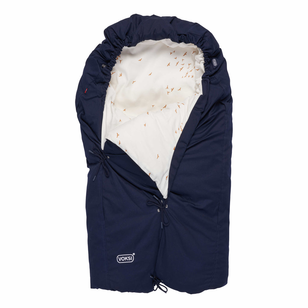 Voksi® Classic+ is loved by many because of the duvet that swaddles the child and has a calming effect. The sleeping bag length can be adjusted naturally as the child grows by tying different positions. Holes in the back allow the bag to be used in a pram with a 5-point harness. A cord around the head area can be adjusted to suit your child’s needs and preferences in different weather conditions. In addition, the sleeping bag can be used as a large play mat when unfolded.