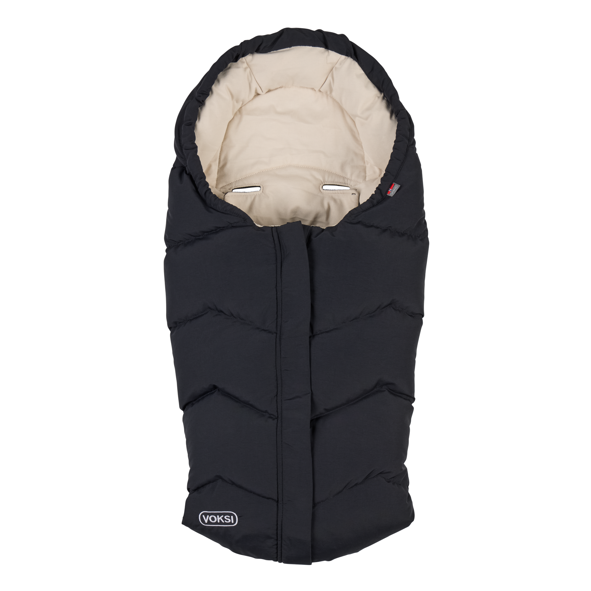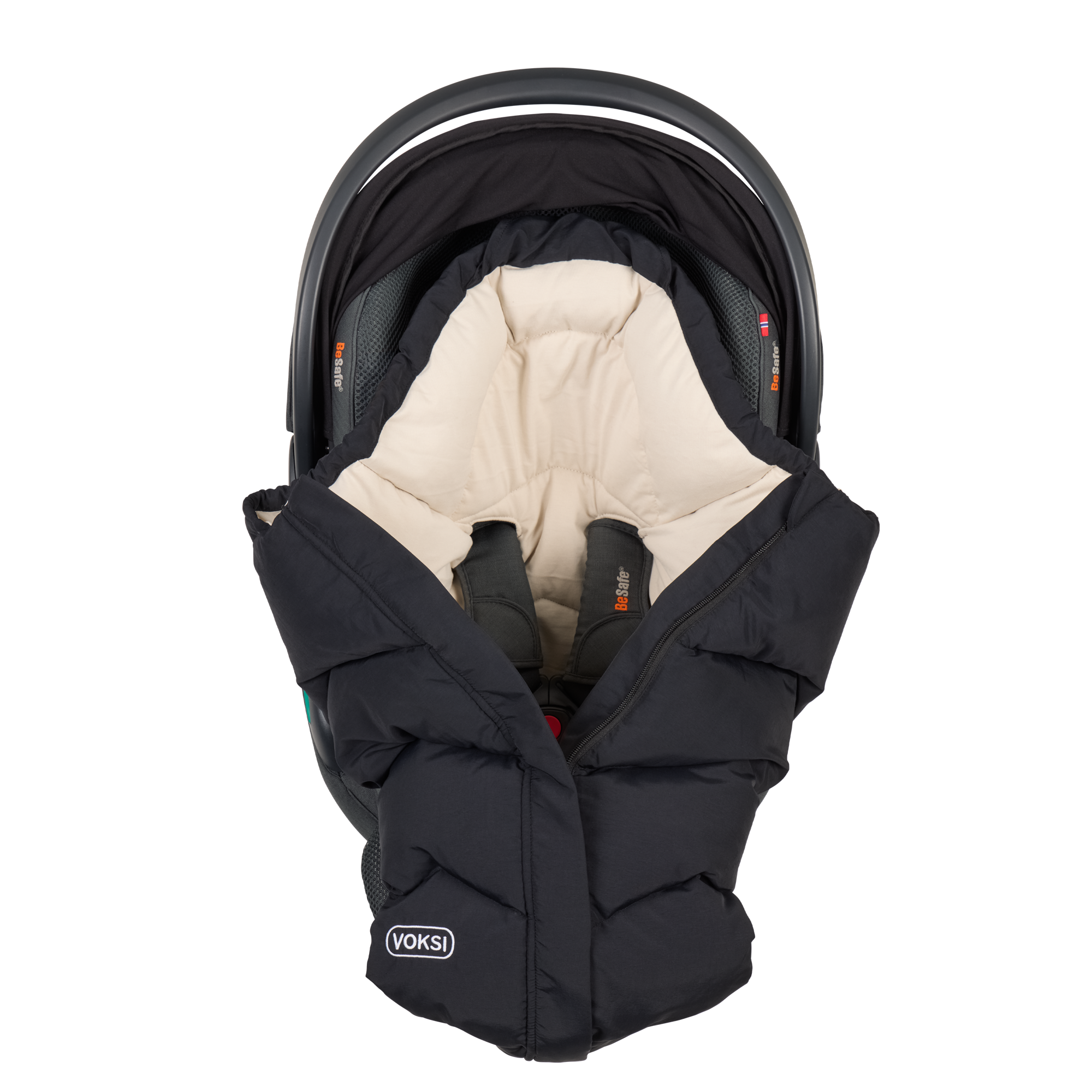 I en bilstol er god installasjon av barnet og korrekt stramming av selen avgjørende. Når den brukes i en bilstol, gir Voksi Move isolasjonen som erstatter yttertøy. På denne måten kan selen i bilstolen sitte nærmere babyens kropp enn om de hadde isolerte klær som dekker skuldre og overkropp. En sentrert glidelås foran gir enkel tilgang til barnet i bilstolen. Den unike utformingen på baksiden med seleåpninger sikrer enkel installasjon og god tilpasning til selen. Trykknapp i ryggen for enkel justering av lengden.