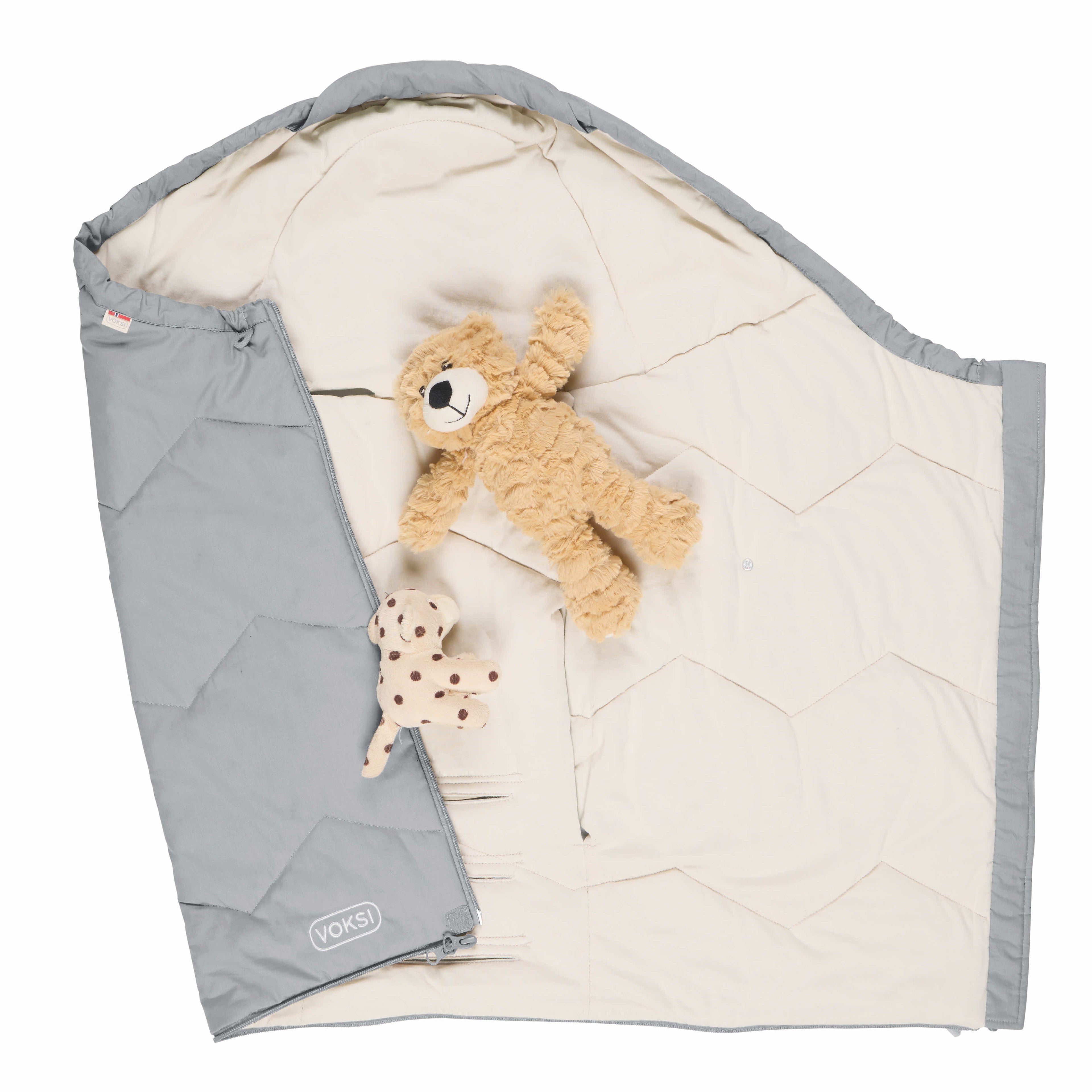 En snor rundt hodeområde kan bli justert til å passe barnets behov og preferanser i ulike værforhold. En glidelås i bunnen sørger også for ventilasjon og mulighet til å kjenne på temperaturen på barnets føtter mens det sover, eller om man vil lufte på varmere dager. Det følger med en forlengerdel som enkelt monteres på vognposen når barnet har blitt lenger og har behov for mer plass. I tillegg kan du folde ut posen og bruke den som leketeppe. Anti-skli materiale i ryggen gjør at posen holder seg på plass i vognen. Den unike utformingen av ryggåpningene gjør at denne posen lett kan monteres og brukes i vogner og bilseter med ulike seler. I bruk med et bilsete, gir Voksi® Sky Light den isoleringen som erstatter litt tykkere ytterklær. På denne måten kan selene i bilsetet sitte tettere på babyens kropp. Voksi Sky Light har blitt kollisjonstestet i kombinasjon med BeSafe bilseter i den anbefalte bakovervendte posisjonen.